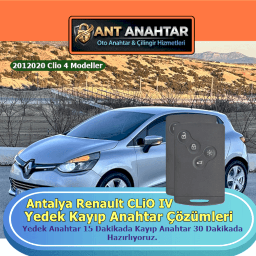 Antalya’da Renault Clio 4 yedek anahtar yapımı ve kopyalama hizmeti sunuyoruz. 2012–2019 model Clio 4 araçlar için immobilizer uyumlu kart anahtarlar dakikalar içinde hazırlanır. Anahtarınız kaybolduysa veya tek anahtarla risk almak istemiyorsanız, Antalya’daki merkezimizde profesyonel cihazlarla yedek anahtar programlama yapıyoruz. Yeni nesil chipli anahtarlar aracınızla %100 uyumlu çalışır. Gerekirse eski anahtarlar sistemden silinerek güvenlik artırılır.